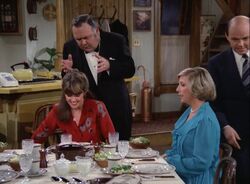As Fred tries to notice out what'due south going on, Mork opens the door to Dave and Caroline enter all dressed up and ready to eat. Dave makes his married woman present Fred with a bottle of wine 'Chateau Lafitte McConnell' from the vineyard he owns north of Napa. As Dave brags nigh the vineyard and the monks who make the vino for them, backside them in the kitchen, Mindy starts to walk around like a chicken, Mork grabbing them to requite them a really short bout while Fred moves quickly to bring together his girl asking if she's okay. But even every bit she tries to reassure him she is, her voice goes strange and she whistles and hoots, before announcing loudly that dinners ready. As they all head to the table, Dave moves to sit at the head of information technology, only for Mindy to barge him out of the way laughing at beating him to it, poking him in the stomach and calling him 'jelly abdomen' quietly infuriating Dave who tells Fred he should go therapy for her. As Mindy lines up a cocktail stick similar a Javelin, Mork tries and fails to cover for her, as Mindy starts to concur a chat with her hand, feeding it olives, and Dave tells Fred she needs electro shock therapy, muzzling and to be sent to obedience school, before she calls him picklepuss and flicks a big spoonful of wild rice in Dave's confront.